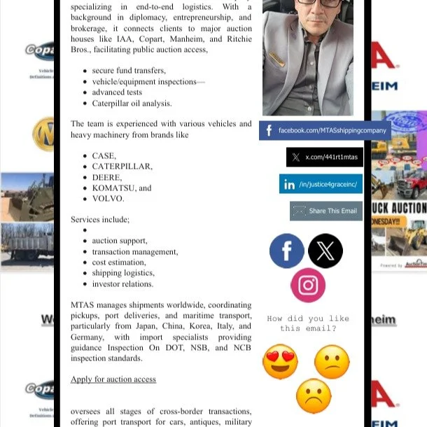 How does MTAS operation work; we offers transparent service for associates, partners, or customers who MTAS do broker deals with, we serve as an agent, secure Customers funds, Inspect the equipment, then we go through with the purchase after finalizing the purchase at auction, we then transport the equipment to the close’s port and seek for the lowest cost of shipping & ship the equipment, with a tracking devices to secure its destination, using AI-driven data management and collaborations to secure the logistics supply chain. They are committed to driving business growth and delivering excellence in every transaction.
